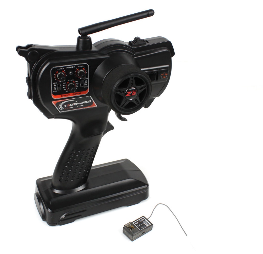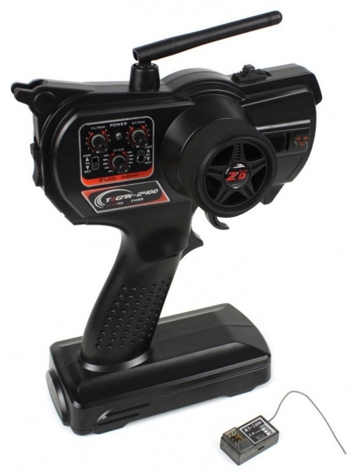 The model is controlled by a transmitter pistol 2.4GHz equipped with gas trimmers and twist, and twist the gas slips. In addition, apparatus has a switch on the third channel, which can be used for example. To the dipped (after having been mounted). Added'll also switch 50/50 - 70/30 allows you to set the speed of forward and backward proportionally or not. All of this bears the ergonomic handle, folding the antenna and mount on the bow to be able to carry a radio around his neck.