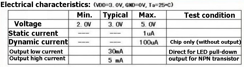 The C005 Shape about 12mm * 12mm, operating voltage 2v-5v, timing can be set to a minimum to a maximum of 2 seconds 1,000 hours, as indicated below description