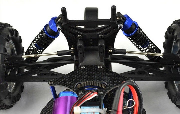 The construction of truggy type allows you to reach high speeds also outside the asphalt. Wide spread of wheels guarantees stability on turnings and right ride height and 4x4 drive allows the car to drive where common racing cars cannot ride. Failure-free brushless engine gives accelaration, which even cars with nitro drive do not have!