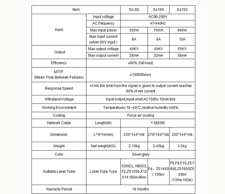 PS-ES-N130/150W, 130W-hoz, vagy 150W-os lézercsőhöz