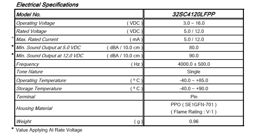MIN. SOUND OUTPUT AT 5VDC ( dBA/ 10 cm ) 80.0