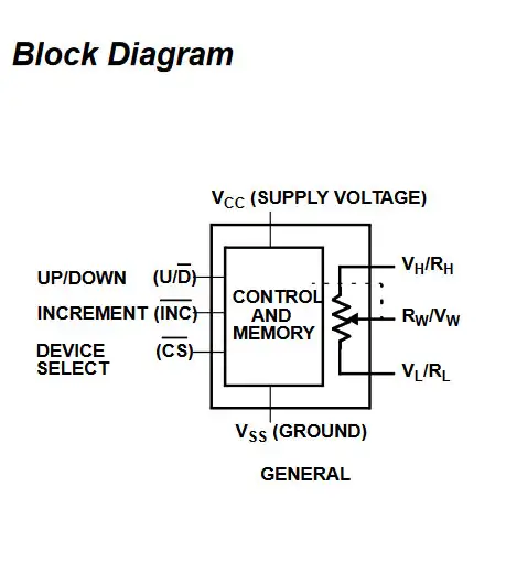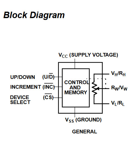 VL and VH digital potentiometer sliding rheostat port corresponding to the low-end and high-end, allowing the input voltage range -5V to + 5V.