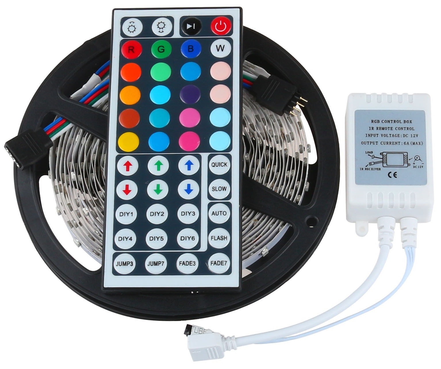 5M-es kiszerelés egyben, színes vezérlővel, szín és fényerő szabályzó, átmenetek, színjátékok