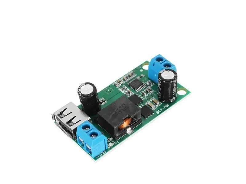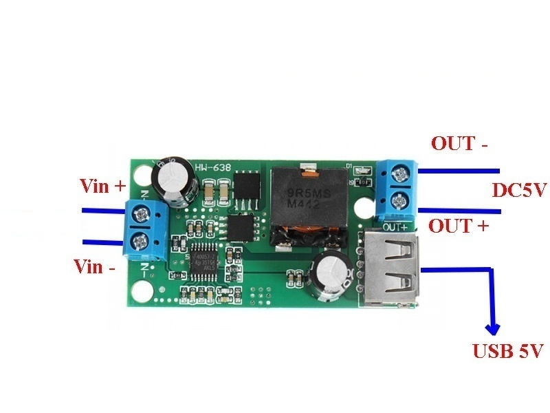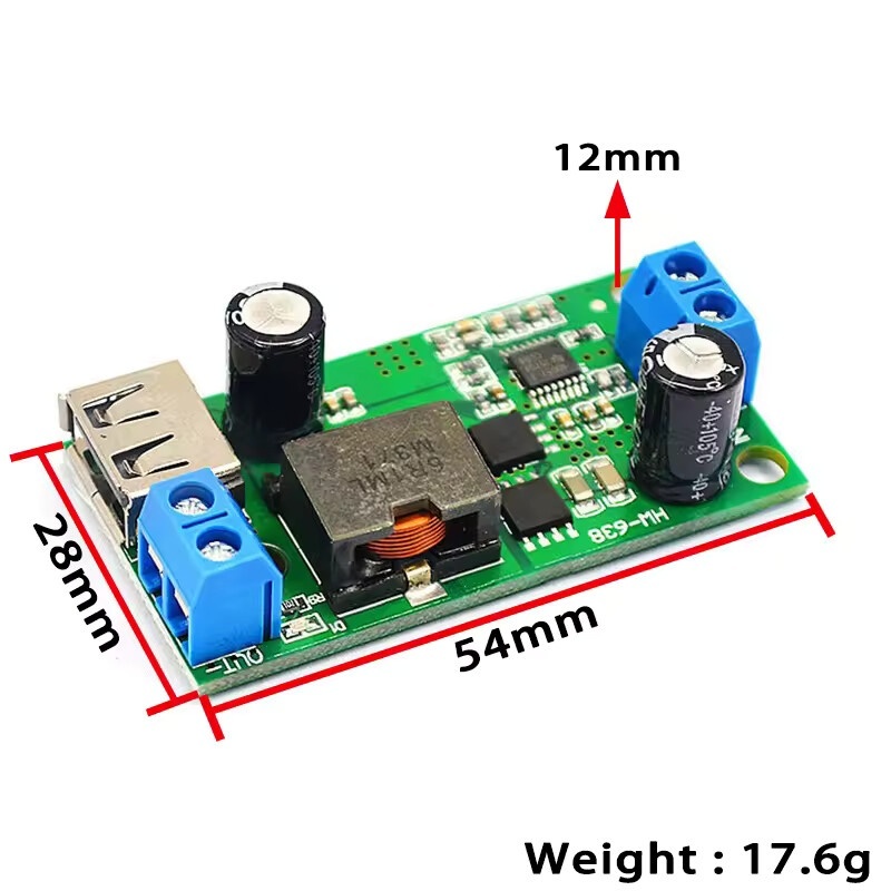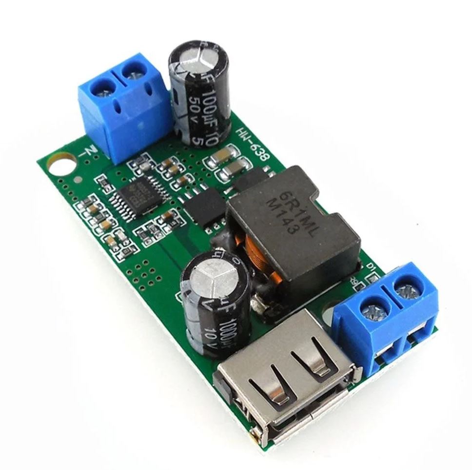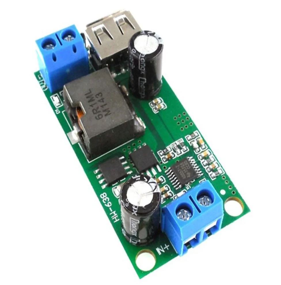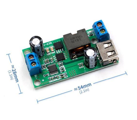Lefele konvertáló fix 5V kimenetű modul. Széles bemeneti tartománnyal (9-38V), így alkalmas akár 9, 12, 24, vagy 36 táplálásra adapterről, és akkumulátorokról is.