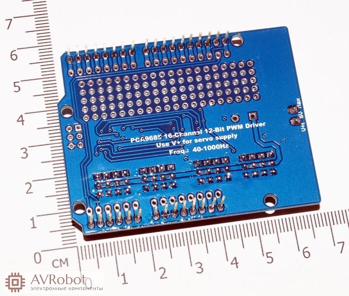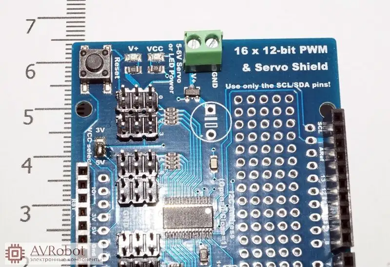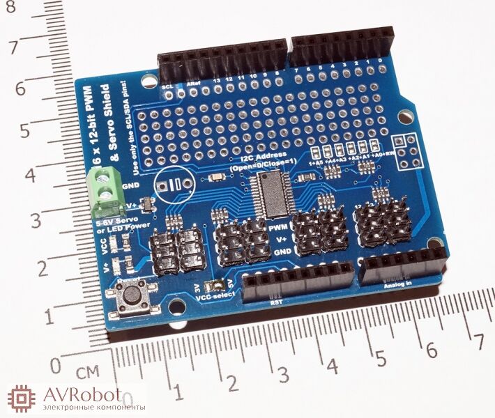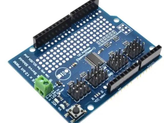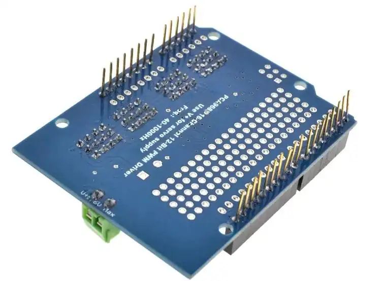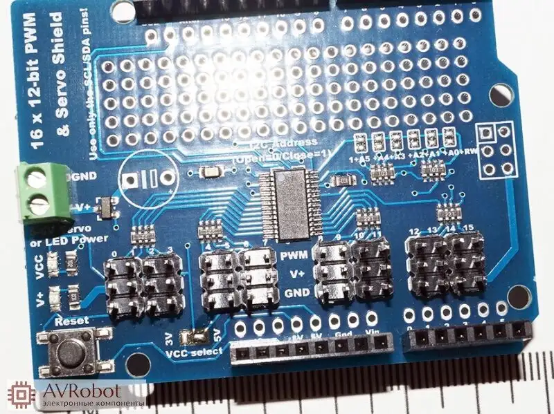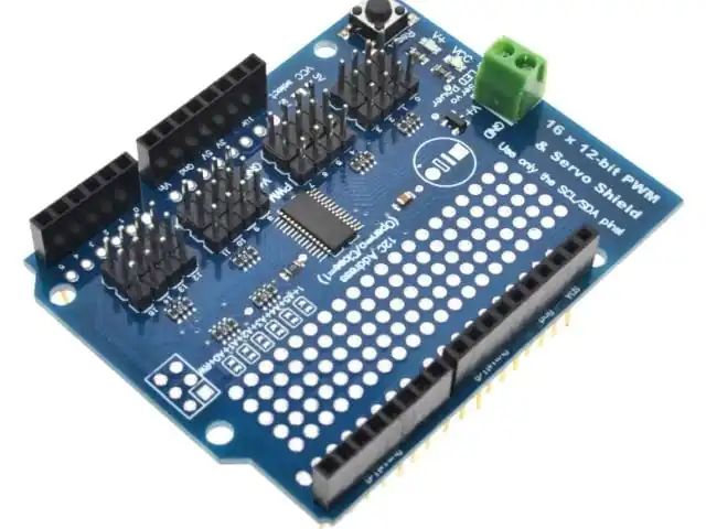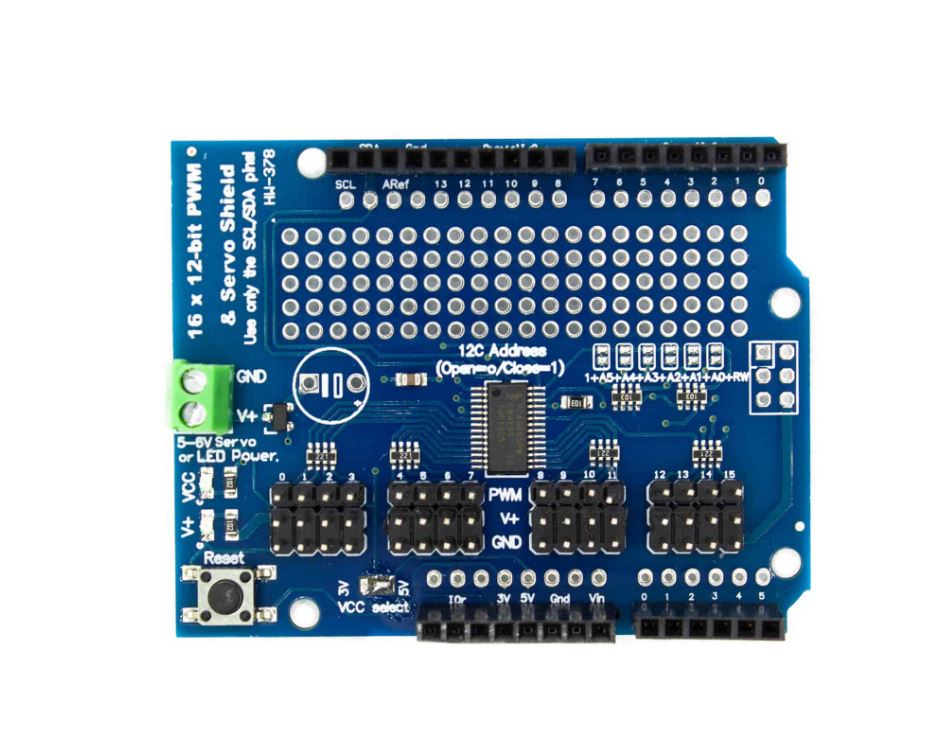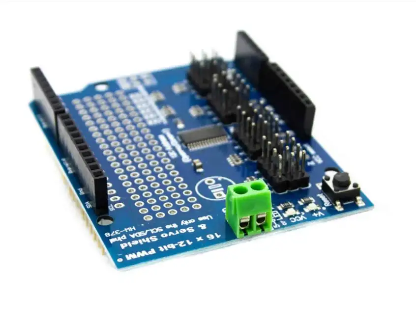 A shield segítségével egyidejűleg 16 darab szervomotort is meghajthatunk. A modul lelke a PCA9685 PWM/szervo vezérlő IC, mely 16 független csatornán 12bites felbontású PWM jelet képes kiadni.