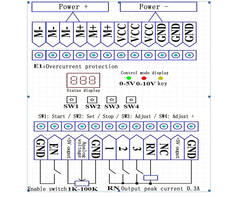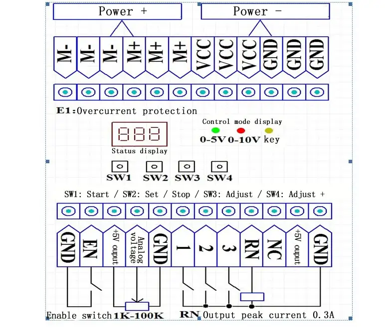 2>.External signal control mode:Turn on EN,through the analog terminal number input signal(the default signal is 0-5V signal, which can be set to 0-10V signal by parameter),the display shows the real-time output PWM duty cycle. stop.