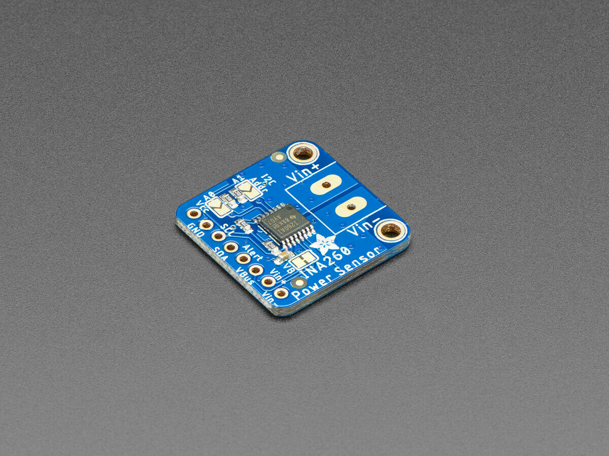 This breakout board may well be the last current sensing solution you every need to buy. Not only can it do the work of two multimeters, but it can do it with amazing precision and flexibility. With it you can measure high or low side DC current, the bus voltage, and have it automatically calculate the power. It can do so over impressive voltage, current, and temperature ranges with better than 1% accuracy, all while delivering the data in an easy to use format over I2C. Works great with any microcontroller that is CircuitPython or Arduino compatible as well as single board computers such as the Raspberry Pi. It is compatible with 3V or 5V logic and can measure bus voltages up to +36VDC. Not for use with AC voltages. Most current-measuring devices operate with some notable constraints that limit what they can be used for. Many are low-side only which can cause issues as the ground reference changes with current. Others like its little sister the INA219B avoid this by measuring on the high side but need to change their shunt resistor to measure different current ranges. The INA260 avoids these limitations, and with it's integrated precision shunt resistor it can be used to measure as much as +36V at up to 15A Continuous on either the high or low side. Wow! The voltage across the integrated 2 milliohm (.002 ohms!), 0.1% shunt resistor is measured by the internal 16 bit ADC, allowing for measurements over the impressive current range with a resolution of 1.5 mA. (The resistance of the resistor is so low that some multimeters will register it as a short!) In a high side configuration the bus voltage measurement and power calculation can be retrieved accurately, however advanced hackers wanting to measure bus voltage in a low side configuration will need to cut the jumper connecting V+ to VBUS and connect the VBUS pin to the voltage bus.