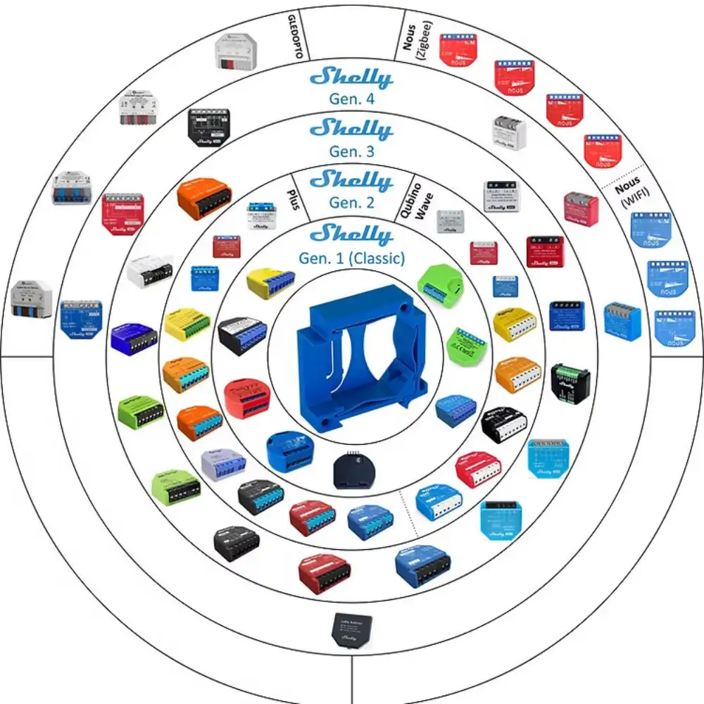- Az új Flexi-Rail típus univerzális kompatibilitást kínál: minden retrofit Shelly modullal kompatibilis – a régi Gen 1 (Shelly 1, 2.5, RGBW2, Dimmer) és új (Gen2 Plus, Gen3, Wave, Gen4, Mini) verziókkal is.