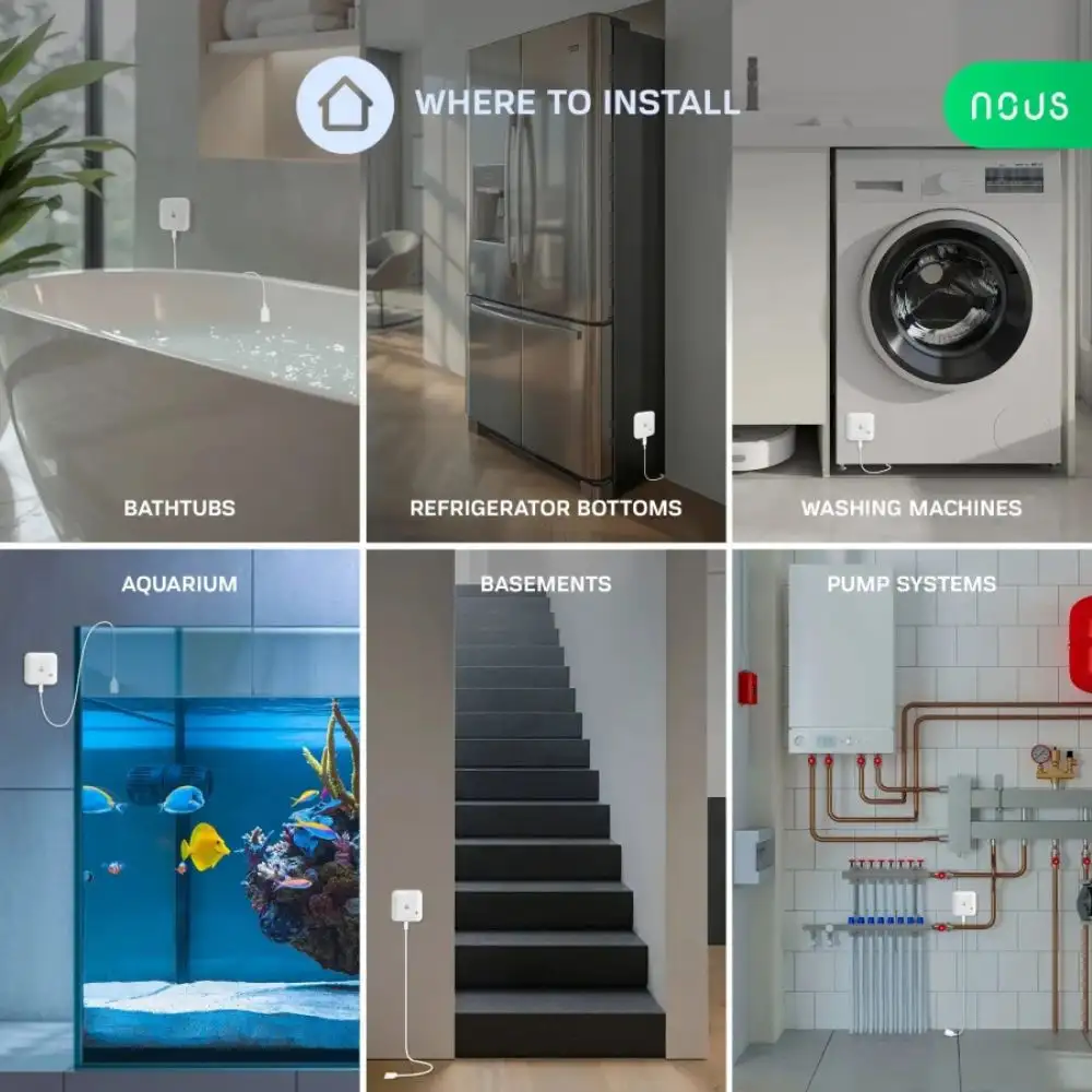 Az E13 ideális választás nedves környezetek monitorozására, például fürdőszobákban, pincékben, mosógépek vagy mosogatók alatt, akváriumok környékén vagy tartályok feltöltésének felügyeletére. A beépített 80 dB-es sziréna és az IP66 védelem lehetővé teszi, hogy az eszköz közvetlenül a veszélyeztetett helyeken legyen elhelyezve, miközben kitart a nedvesség és por ellen. Kompatibilis a Home Assistant és Tuya/SmartLife rendszerekkel.
