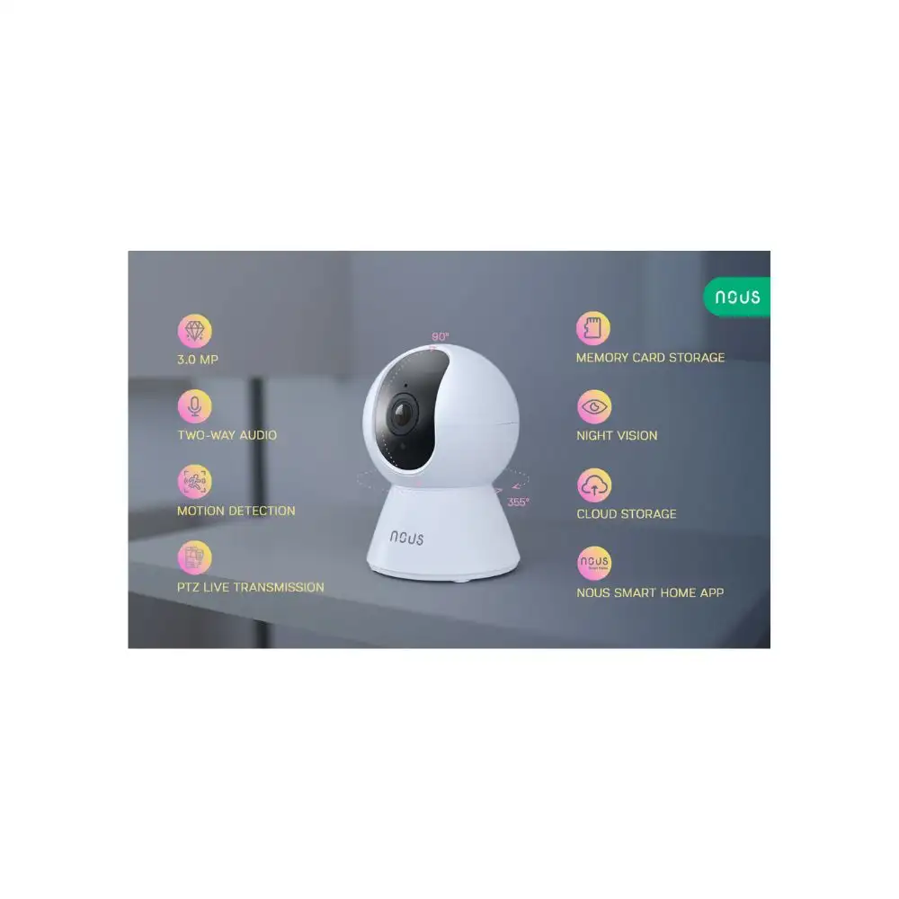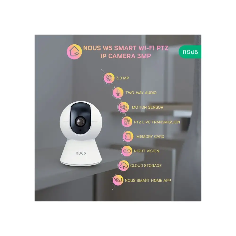 A Nous W5 okos Wi-Fi kamera egy PTZ, motorosan mozgatható, nagyobb 3 MP felbontású eszköz, melynek segítségével távolról is követheted az otthoni eseményeket. A kamera a Tuya / SmartLife felhős okosotthon platformot használja.