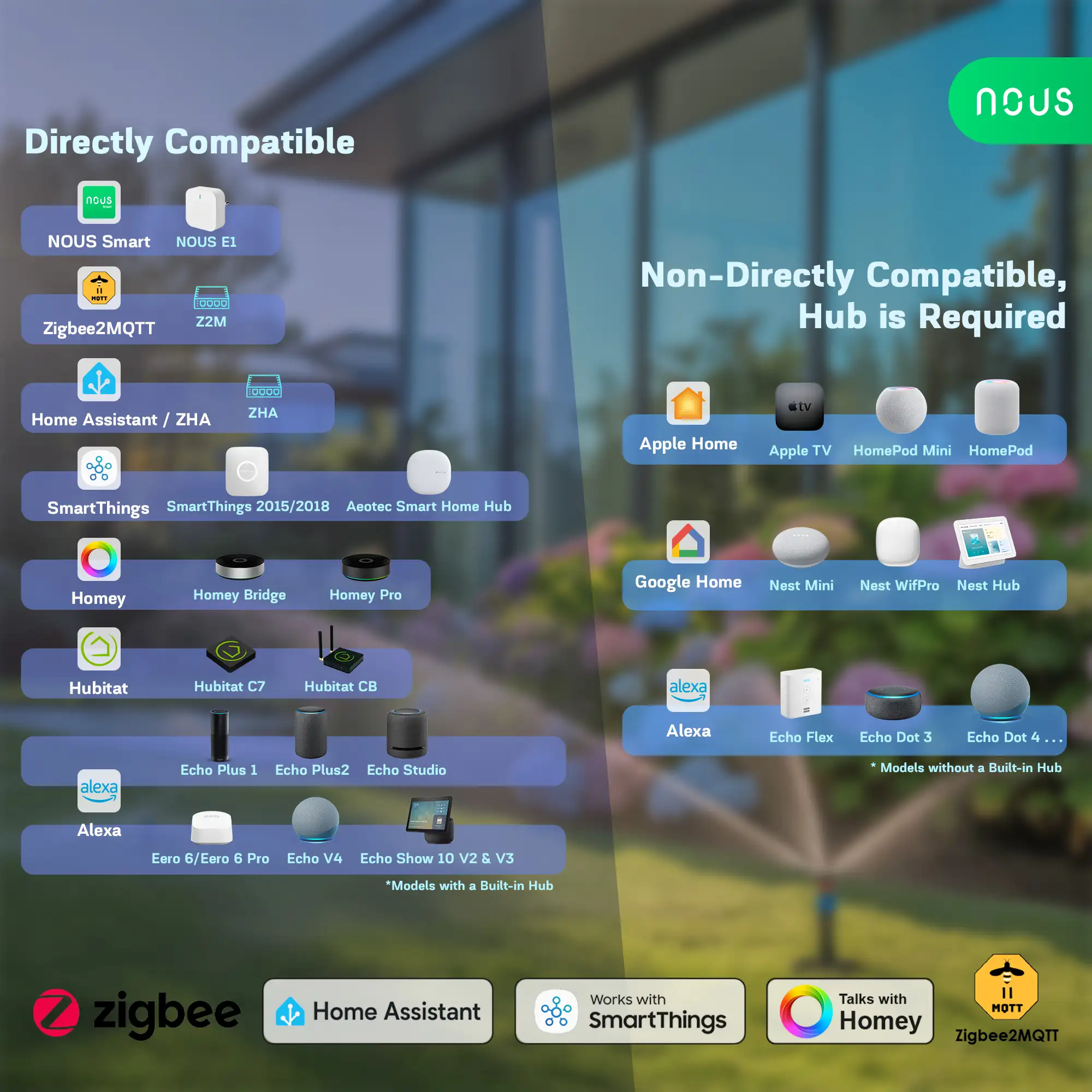 A Nous L14 öntözőszelep a Tuya Zigbee protokollt használja, ami stabil és megbízható kommunikációt biztosít. A telepítés egyszerű, és a vezérléshez mindössze egy kompatibilis Tuya / SmartLife Zigbee átjáróra van szükség, de a készülék kompatibilis a Home Assistant Zigbee koordinátorokkal és a felhős Amazon Alexa és a Google Assistant hangvezérlőkkel is, így hangutasításokkal is irányítható.
