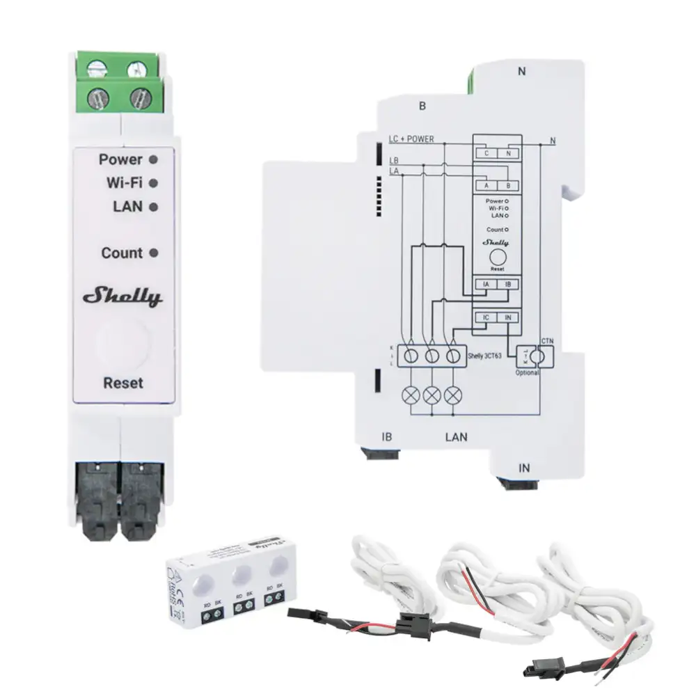 A Shelly Pro 3EM-3CT63 egy DIN-sínre szerelhető, egy- vagy háromfázisú energiamérő, mely képes helyi hálózaton (LAN / Wi-Fi) önállóan működni, vagy felhőalapú automatizálási rendszerekhez is csatlakozhat Modbus, MQTT, HTTPS vagy WebSocket protokollon keresztül, TLS titkosítással.
