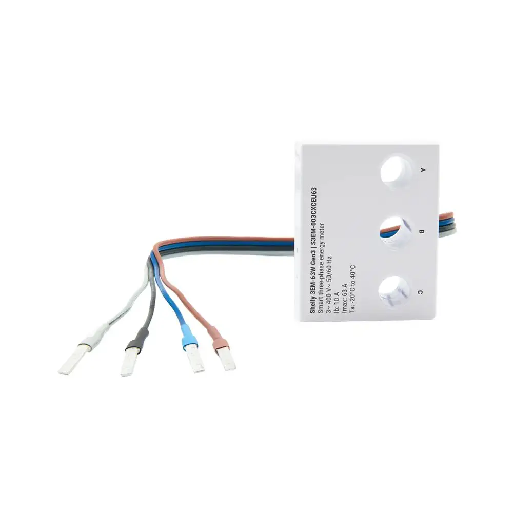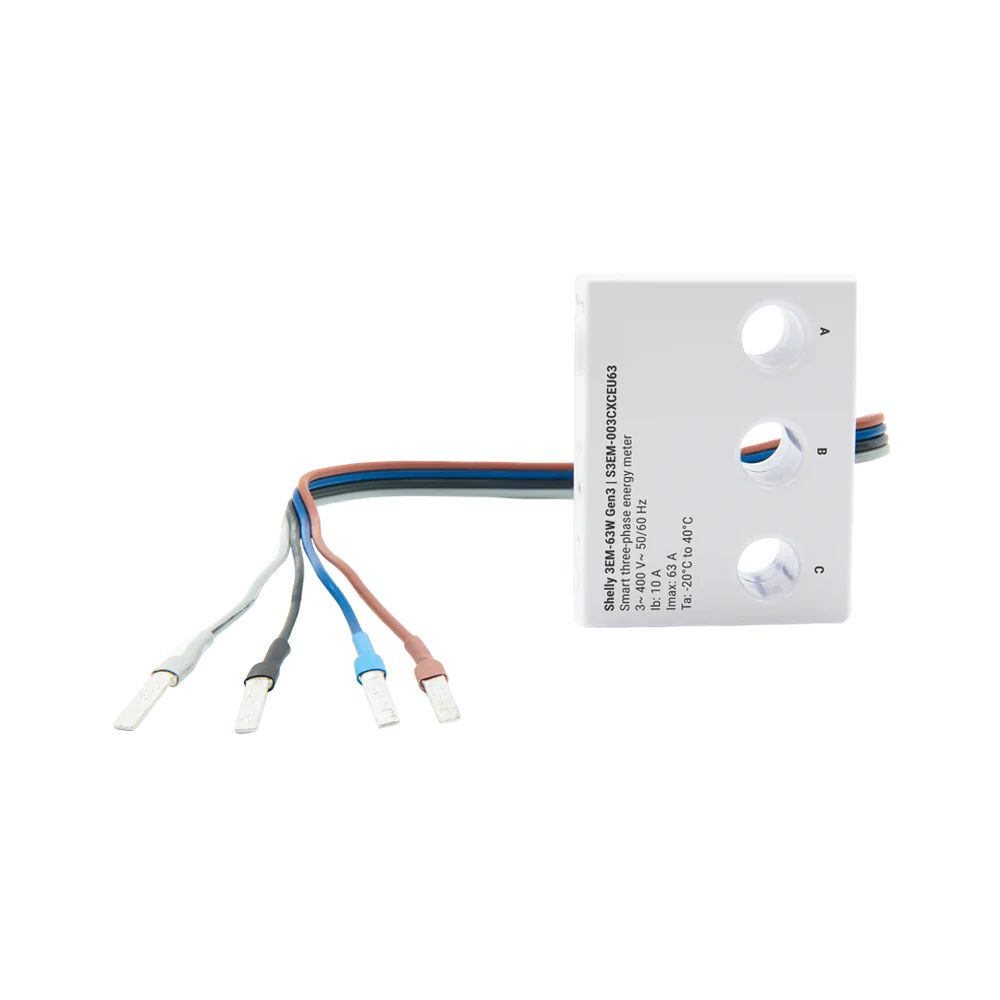 - Shelly 3EM-63W Gen3: Ez a modell vezetékekkel van ellátva, amelyek rugalmasabbá teszik a telepítést, különösen akkor, ha az eszközt nem lehet közvetlenül a megszakítóhoz csatlakoztatni. Ez a kialakítás lehetővé teszi az eszköz távolabbi elhelyezését a megszakítótól, ami hasznos lehet bizonyos telepítési környezetekben.