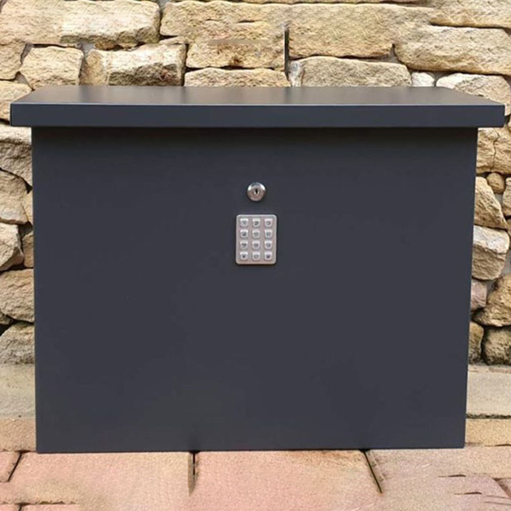 A csomagátadó láda teljes egészében fémből készül, 50 x 40 x 26,7 cm külső méretekkel, RAL 7016 antracit szürke színnel.Kültéri IP44 kivitel, időjárásálló.