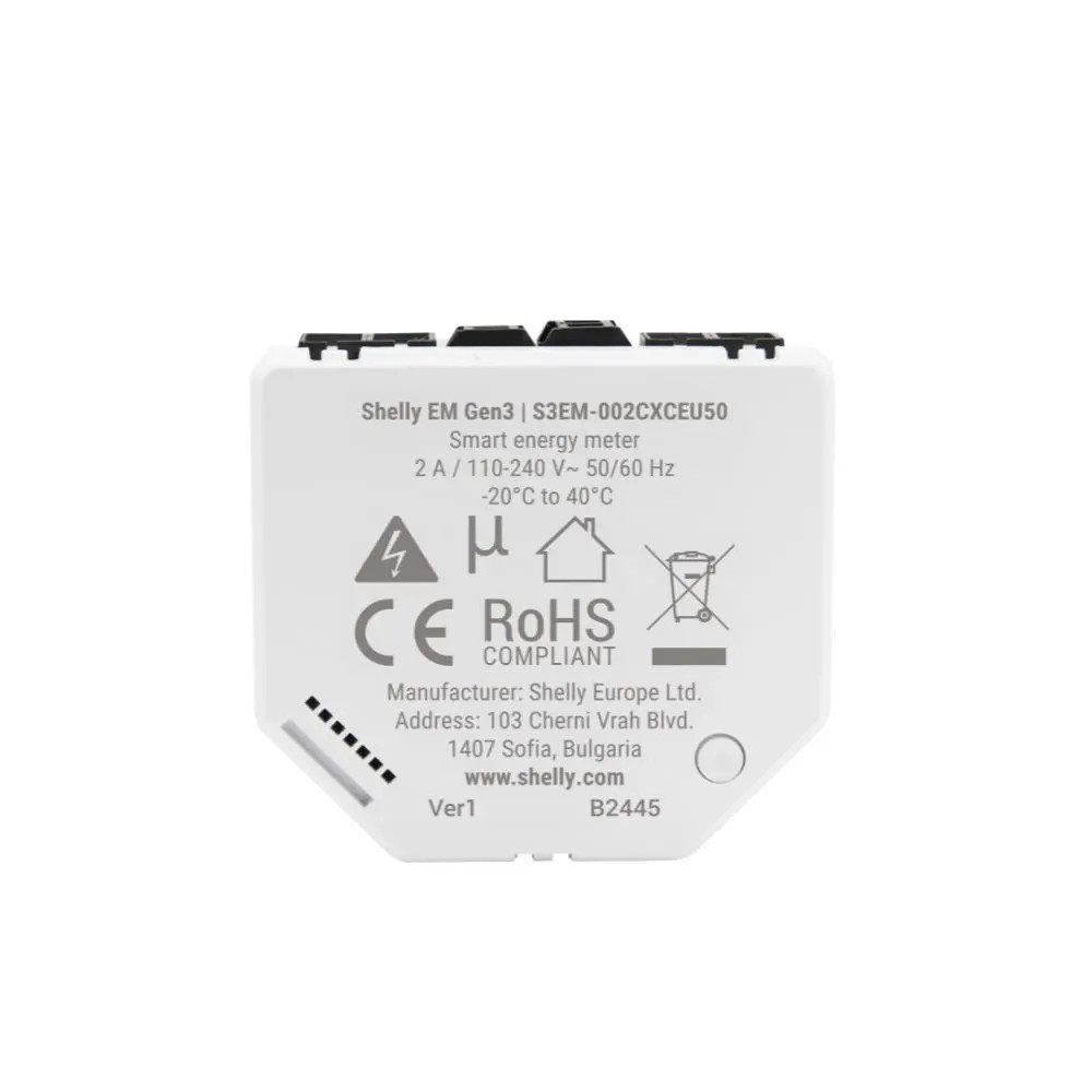 A Shelly EM Gen3 egy okos egyfázisú fogyasztásmérő eszköz Wi-Fi és Bluetooth-kapcsolattal, amely két áramkör kontakt nélküli mérésére is képes akár két áramváltóval is. A készülék 8 MB memóriával és akár 10 napos helyi adattárolással rendelkezik, és az MQTT, HTTP és WebSocket protokollokon keresztül zökkenőmentesen integrálható az okos épület automatizálási és okosotthon rendszerekbe.
