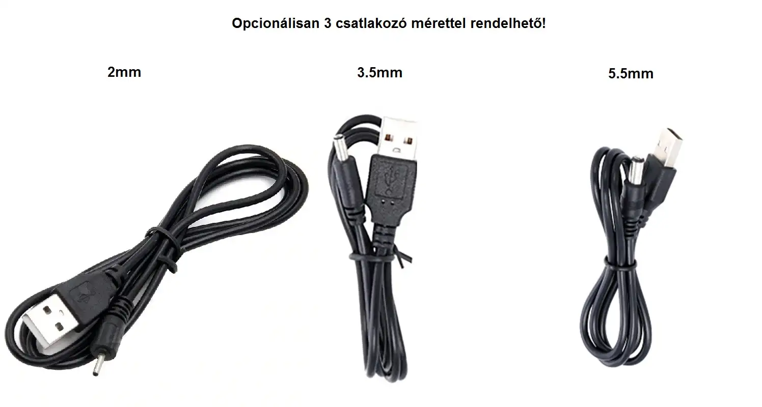 (névlegesen 5V szabvány USB esetén, de maximum 12V-ig és 2.5A-ig alkalmazható egyedi kötések esetén)