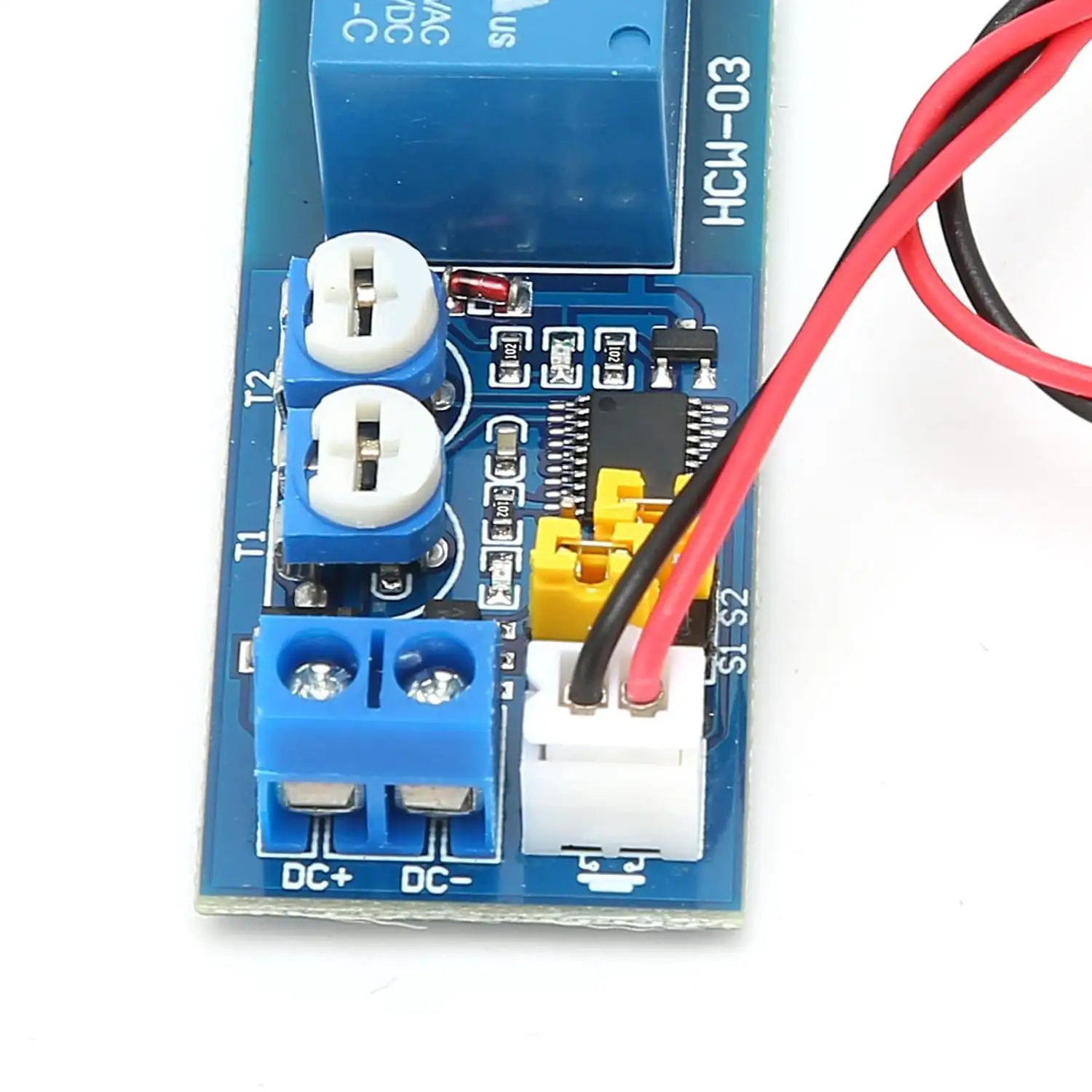 Jumperrel(S1) állítható idő szorzók, így rövidebb időzítésre nagyobb pontosság állítható be a potméterekkel, külön a bekapcsolási és a kikapcsolási időtartománynak.