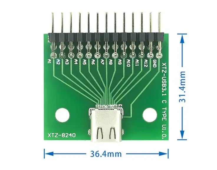 Az USB C-type összes láb kivezetése megtalálható 2.54mm dupla tüskesorra, professzionális eszközök fejlesztéséhez, prototípus gyártáshoz.