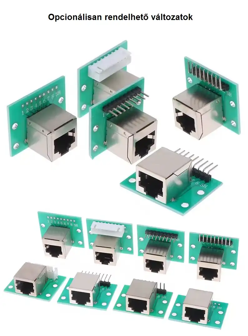 Opcionálisan külön rendelésre függőleges vagy vízszintes RJ45 csatlakozóval, és tüske oldalról egyenes függőleges csatlakozóval, csatlakozó nélkül, vagy XH csatlakozóval is kérhető.