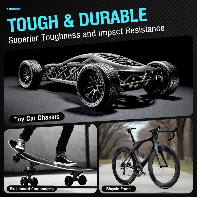 A szénszálas erősítés jelentősen megnöveli a PETG szívósságát, és lenyűgöző, 19 kJ/㎡ ütésállóságot ér el. Ez biztosítja, hogy a nyomtatott modellek tartósak, repedésállóak és ideálisak az igényes alkalmazásokhoz.