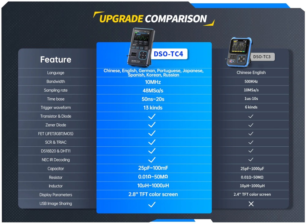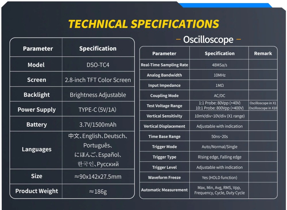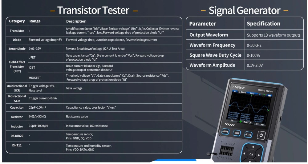 A DSO-TC4 egy sokoldalú, multifunkciós tranzisztor oszcilloszkóp, amelyet a FNIRSI fejlesztett ki. Komplex és praktikus eszköz, amelyet kifejezetten karbantartási és K+F felhasználásra terveztek. Egyesíti az oszcilloszkóp, a jelgenerátor és a tranzisztor teszter funkcióit egyetlen készülékben.