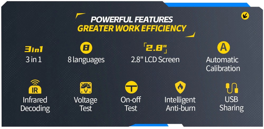 - Magas hatékonyság: automatikusan felismeri a tesztelt alkatrész típusát és kivezetéseit, ezzel egyszerűsítve a használatot és növelve a tesztelés sebességét