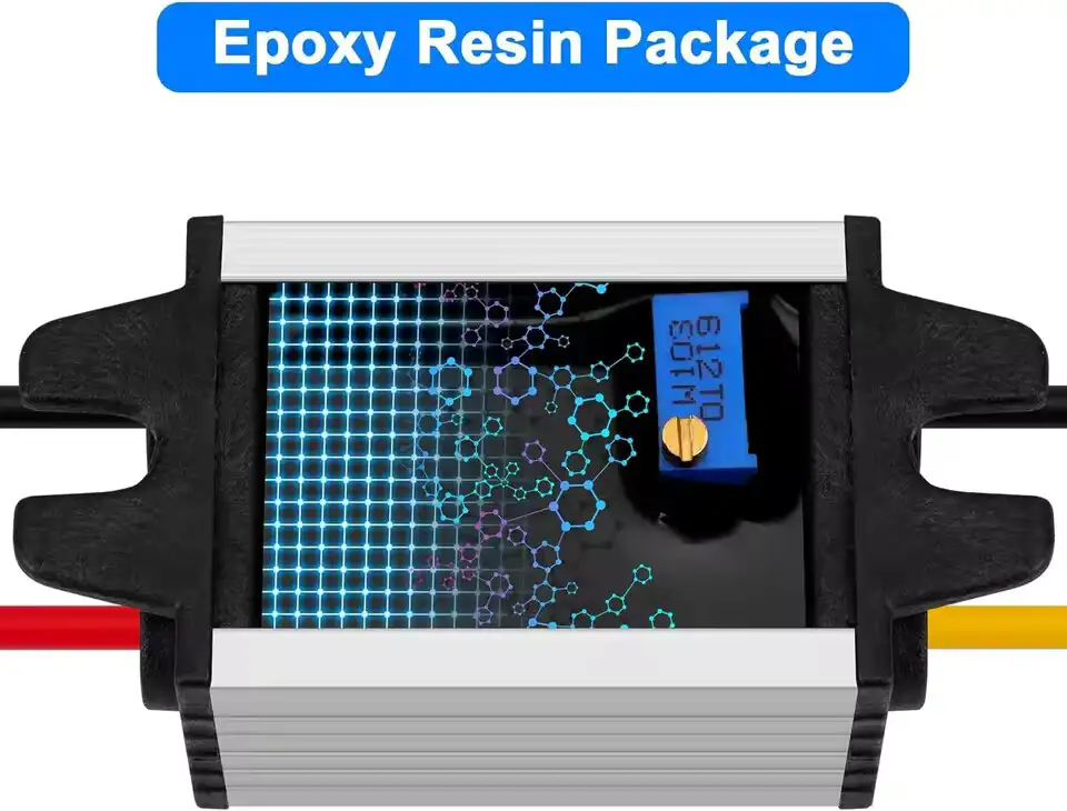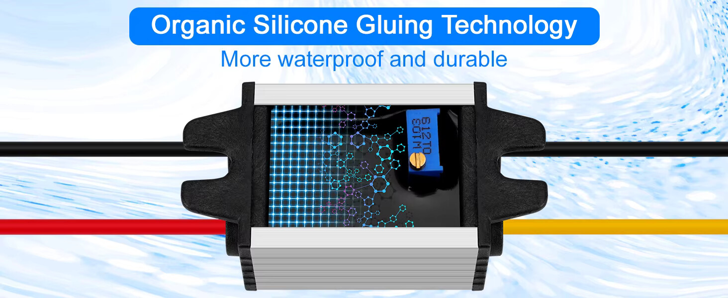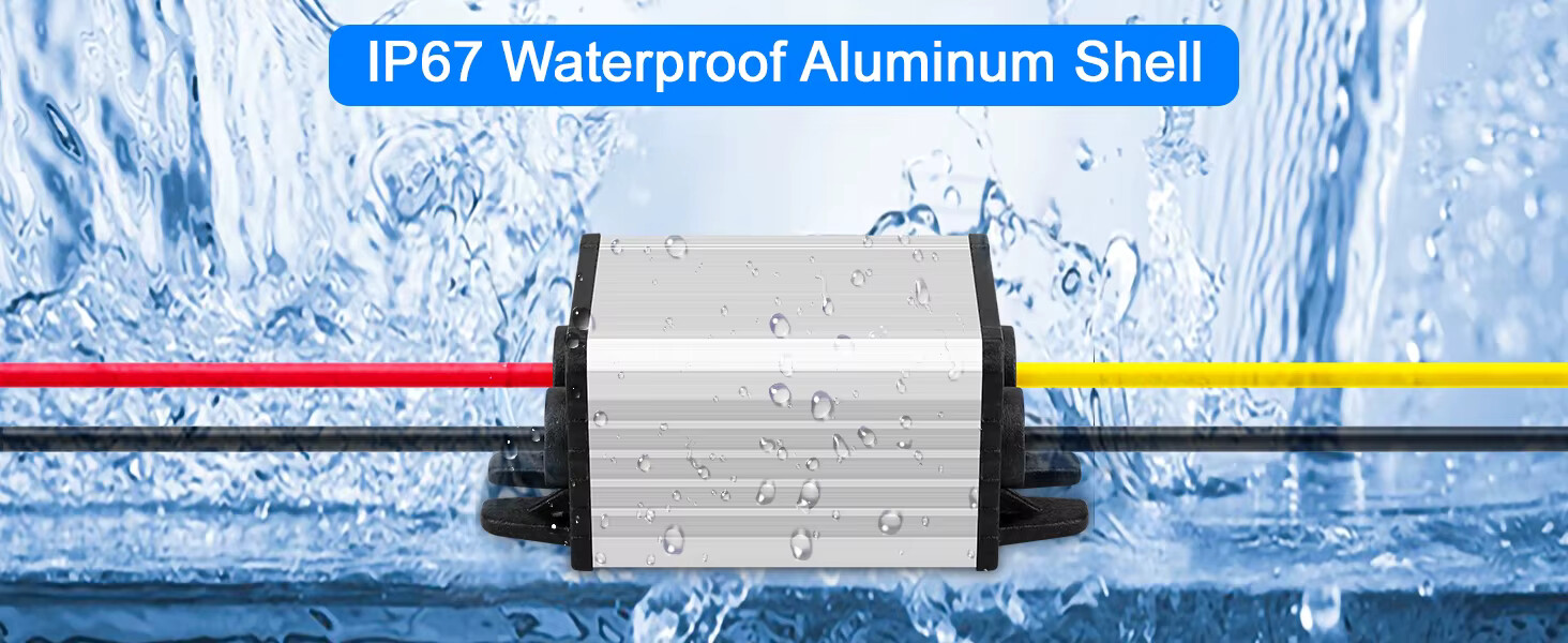 Aluminum Case & Silicone Sealed Design: The exterior of the voltage converter has an aluminum case as a heat sink and is especially waterproof, shock-proof, moisture-proof and dust-proof. The unit is internally sealed inside melted plastic and filled with potting compound