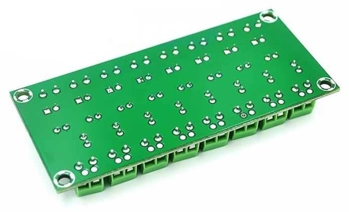 5.Features :Using 8-way 817 optocoupler, to achieve the control signal and the control signal isolation, you can directly use the microcontroller or other devices IO port to achieve voltage isolation control, you can achieve a small voltage control, the control side can be an external transistor MOS tube or different voltage levels Of the device interface