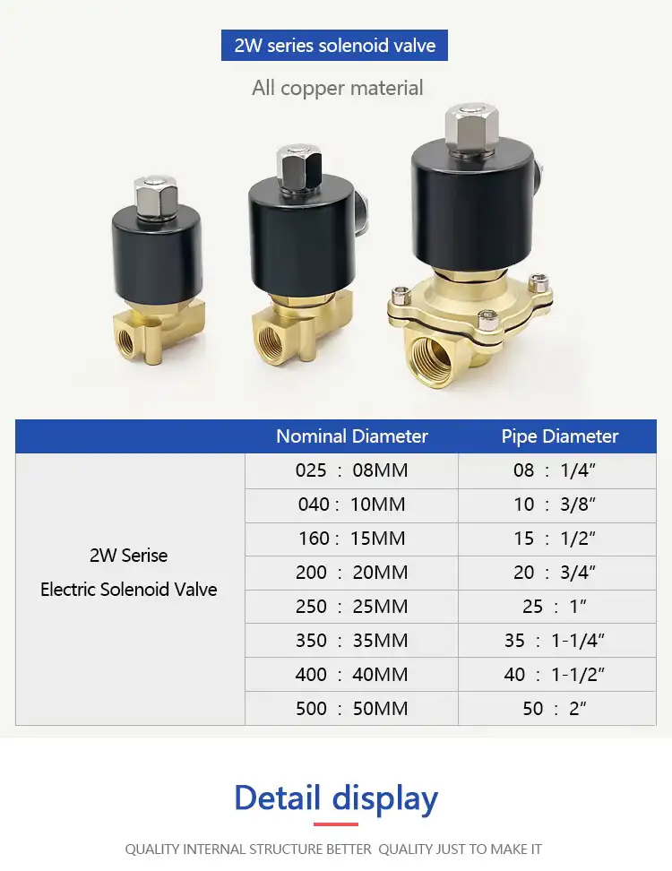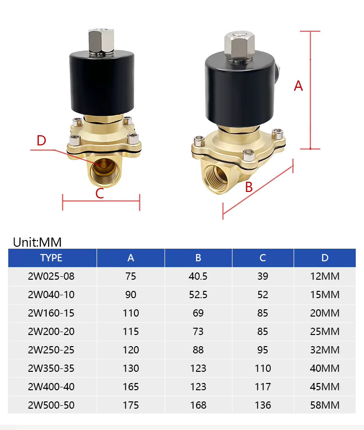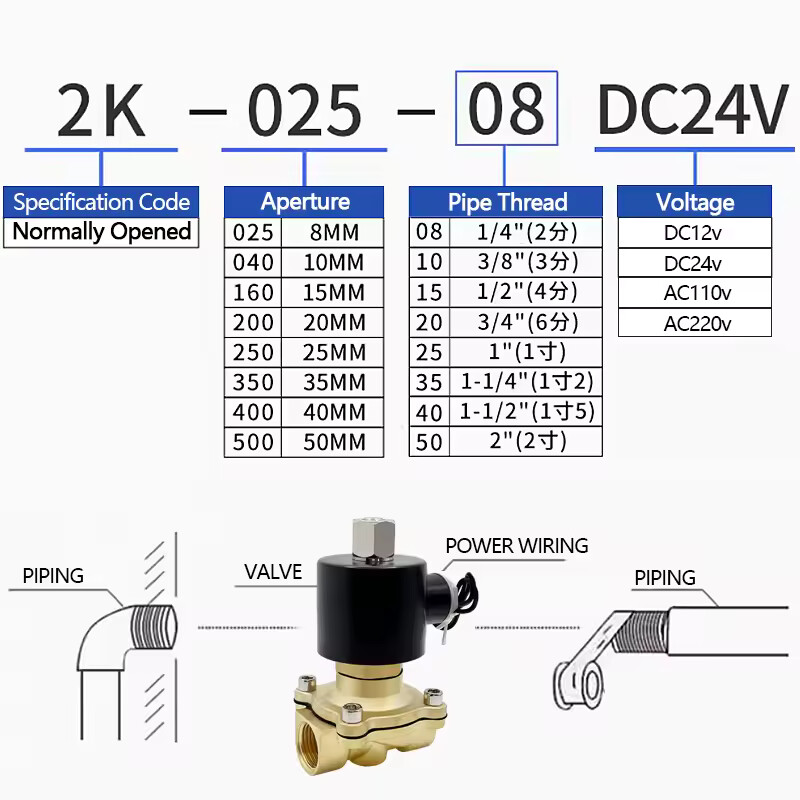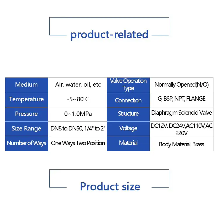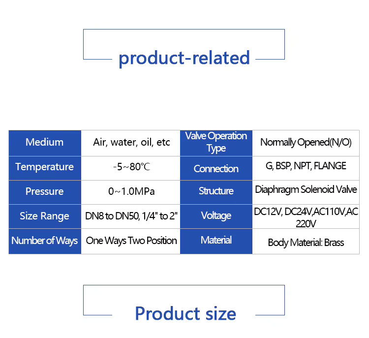 Méretek: DN8-tól DN50-ig, azaz 1/4"-tól 2"-ig opcionálisan DC 12V, DC 24V és AC 220V-os változatokban.