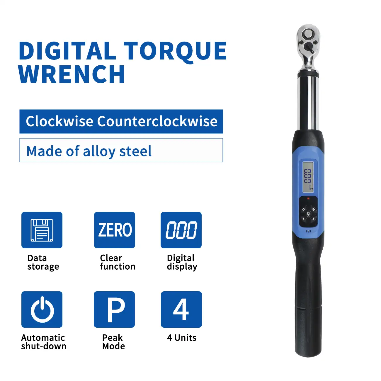 A ratchet-head digital display torque wrench and replaceable head digital display torque wrench are different from normal torque wrench, wherein the AWJC replaceable head wrench with its attached ratchet head can be replaced with an open head, a plum blossom head, a movable opening head,etc at any time. Both have powerful operating functions, including torque setting; unit setting; mode setting; value storage; value clearing; value output and user correction function. With easy operation, the digital display is installed to reduce the requirement on the operator. It is applicable to the fastening and control of bolts in automobile industry, machinery industry,etc.