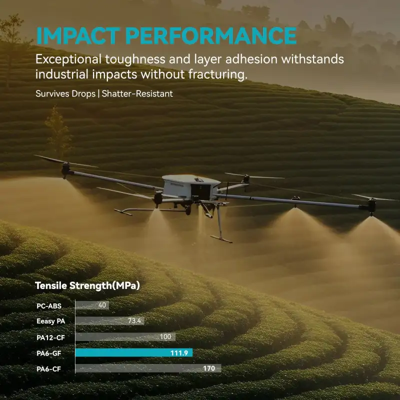 Alacsony nedvességfelszívás: A PA6 alapanyagból adódóan sokkal kevésbé szívja magába a párát, mint a legtöbb nylon (pl. PA6), ezért jobb a méretstabilitása, kisebb a vetemedés és pontosabb a nyomtatás, még ha nem is szárítod ki közvetlenül használat előtt.