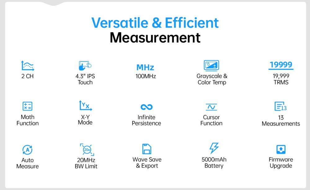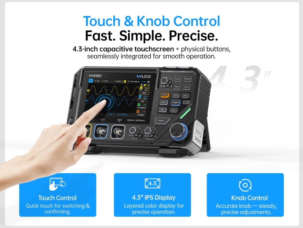 A 4,3" IPS érintőkijelző és a fizikai vezérlők kombinációja gyors kezelhetőséget biztosít, miközben a készülék teljesítménye bőven elegendő a legtöbb analóg és digitális elektronikai mérési feladathoz.
