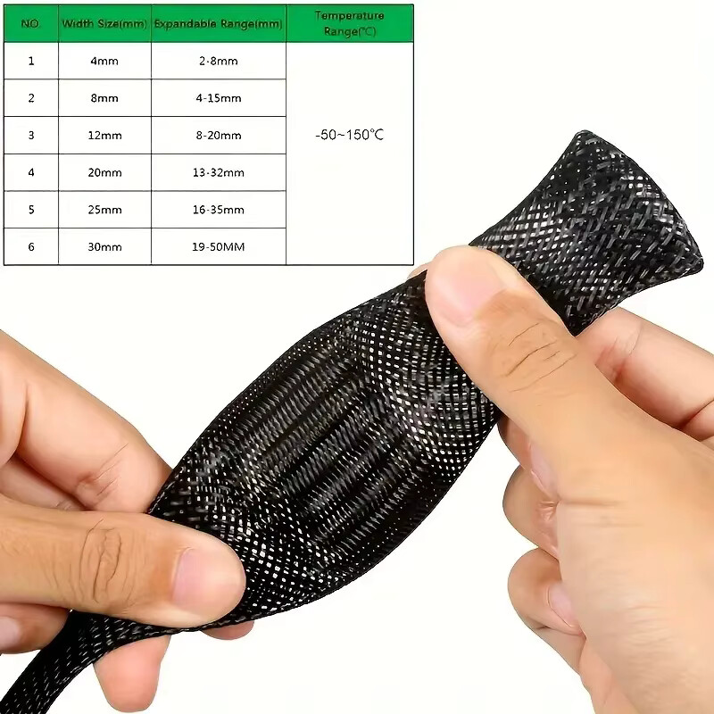 Nyújtható kábelharisnya vezetékek rendezésére. Sokréteű felhasználása az audiótechnikában, ipari gépeknél, 3D nyomtatók, CNC-k automatikai berendezések kábeleinek elvezetésére és rendezésére.
