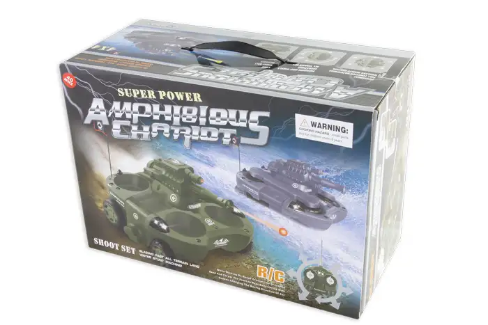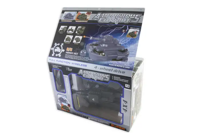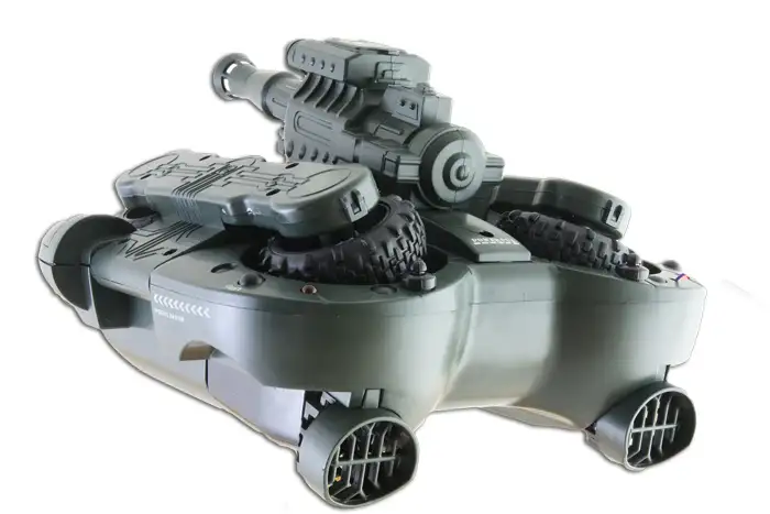 Ez a kétéltű tank egy teljesen távirányítható katonai jármű, ami földön-vizen, bármilyen terepen elboldogul. Ráadásul még valódi műanyag golyókat isképes kilőni 20-30m-ig. Tökéletes játék a fiatal felfedőzknek.