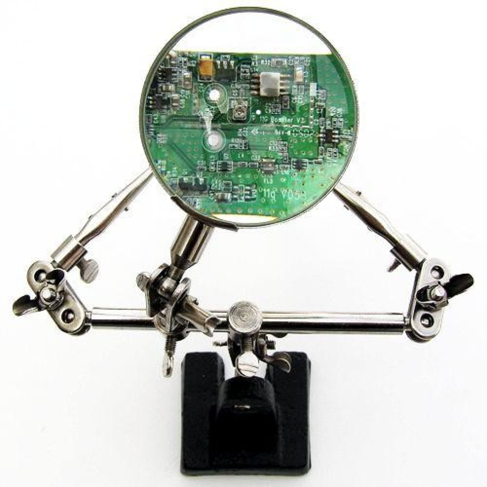 A nagyító szintén gömbfejjel konnektál a szerkezethez, amit minden irányba mozgathatunk, a két lapka közé szorítva szárnycsavarokkal rögzíthető. Nagy segítséggel lehet apróbb alkatrészek szereléséhez, forrasztásához
